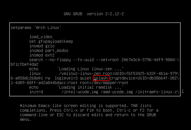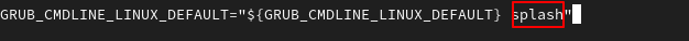 Remove splash from the second GRUB_CMDLINE_LINUX_DEFAULT near the end and hit Ctrl+X to save and quit (hit Y to save, Enter to save as the same file name).