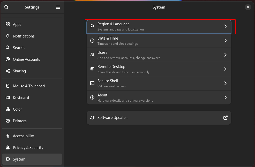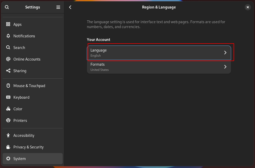 Now, set your language. In the default GNOME desktop, you need to go to Settings > System > Region and Language.