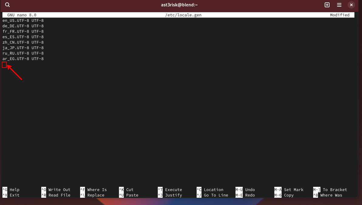 Go to the end with the arrow keys and hit Enter to make a new line. Paste your country code in with Ctrl+Shift+V or just type it. Hit Ctrl+X to save.